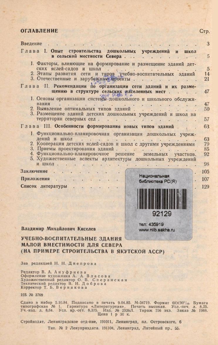 Учебно-воспитательные здания малой вместимости для Севера : (на примере строительства в Якутской АССР) / В. М. Киселев. - Ленинград : Стройиздат, Ленинградское отделение, 1985. - 131, [1] с.