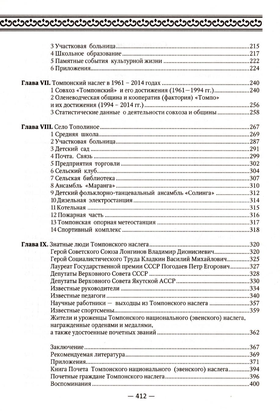 В книге на большом фактическом материале освещается история томпонских эвенов, образование и развитие Томпонского национального (эвенского) наслега современного Томпонского района (улуса) в 1931-2014 г. Раскрываются достижения тружеников наслега в материальном производстве и духовной культуре, социальное развитие села Тополиное, содержатся материалы (очерки) о всех предприятиях, учреждениях села, а также о некоторых знатных людях наслега. В приложении помещены многочисленные, разнообразные материалы
