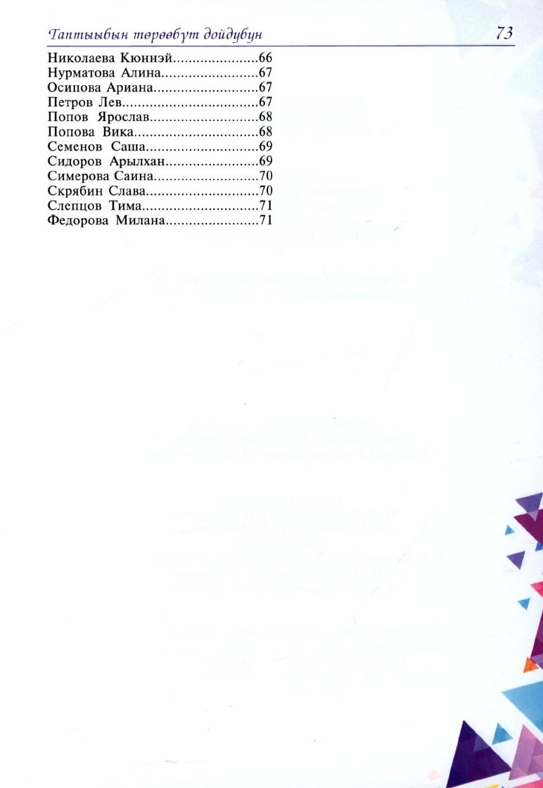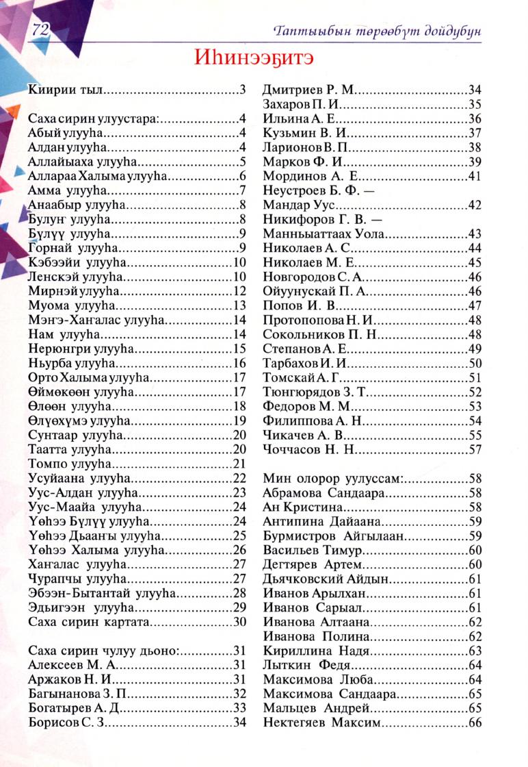 Таптыыбын төрөөбүт дойдубун : [Дьокуускай куорат Саха гимназия 4 "б" кылааһын бырайыага] / хомуйан оҥордулар: И. В. Хомподоева, Н. П. Жерготова, Л. Г. Иванова, Е. М. Максимова ; эрэдээктэрдэр: Л. Г. Иванова, Е. М. Максимова, Н. В. Аввакумова уо. д. а. ; [киирии тылы суруйдулар: И. В. Хомподоева, Н. П. Жерготова]. - Дьокуускай : [и. с.], 2022. - 73, [1] с.