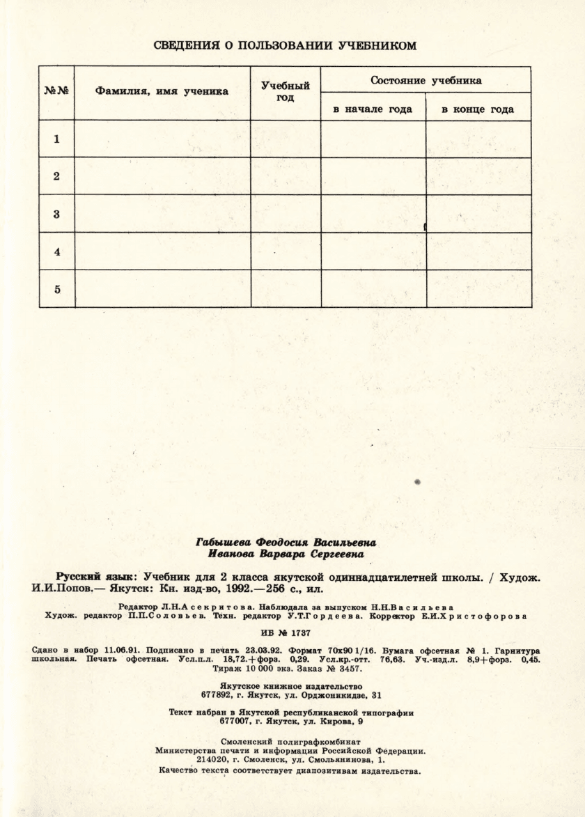 Русский язык: учебник для 2-го класса якутской одиннадцатилетней школы