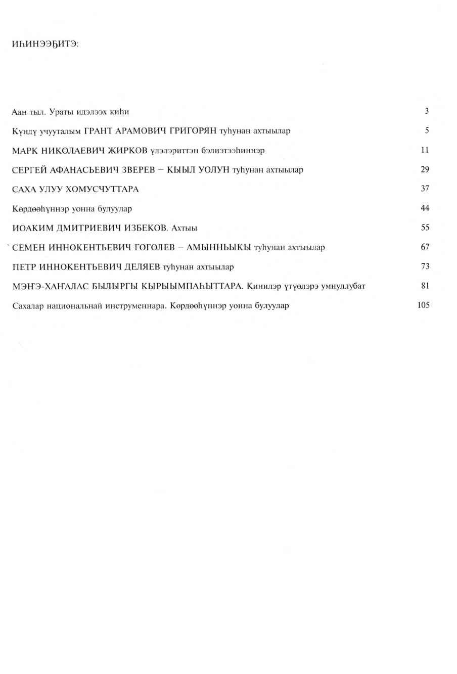 Александр Чахов в своей книге подробно пишет о якутских народных музыкальных инструментах. Часть материалов использовал с архива Республиканского Дома народного творчества. В книгу также вошли воспоминания о великих учителях Г. А. Григоряне, М. Н. Жиркове, народных исполнителях, мастерах и их технологиях