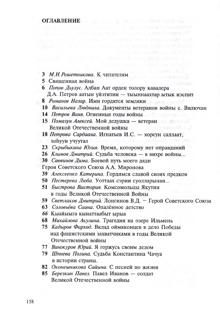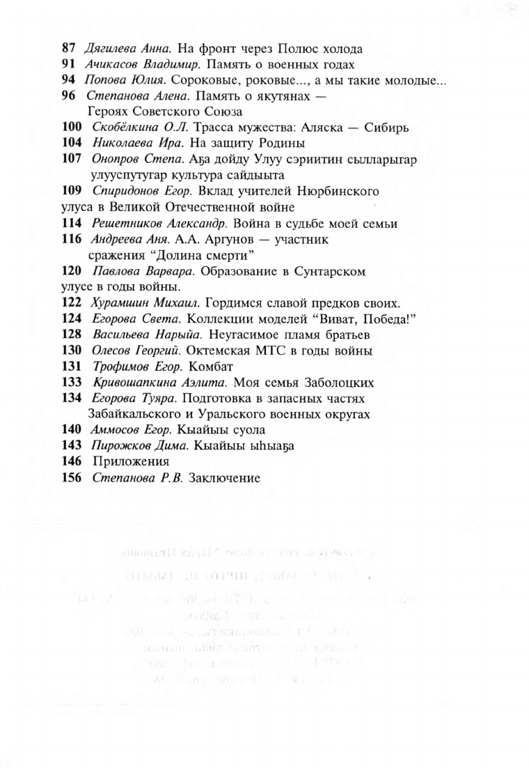 Никто не забыт, ничто не забыто : доклады участников республиканской научно-практической конференции школьников "Во имя жизни на земле", посвященной 60-летию Победы в Великой Отечественной войне / [составитель М. И. Решетникова]. - Якутск : Сайдам, 2005. - 158, [1] с. : ил.