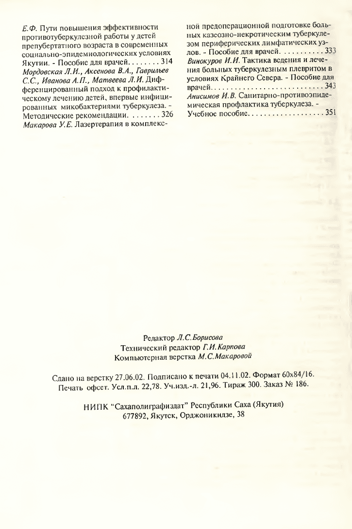 Проблемы туберкулеза в Якутии: эпидемиология, организация и лечение : сборник трудов / Министерство здравоохранения Республики Саха (Якутия), Якутский научно-исследовательский институт туберкулеза ; [редколлегия: М. А. Тырылгин (главный редактор) и др.]. - Якутск : [б. и.], 2002-