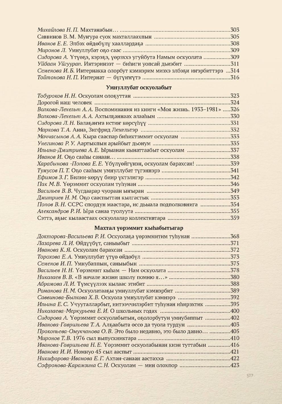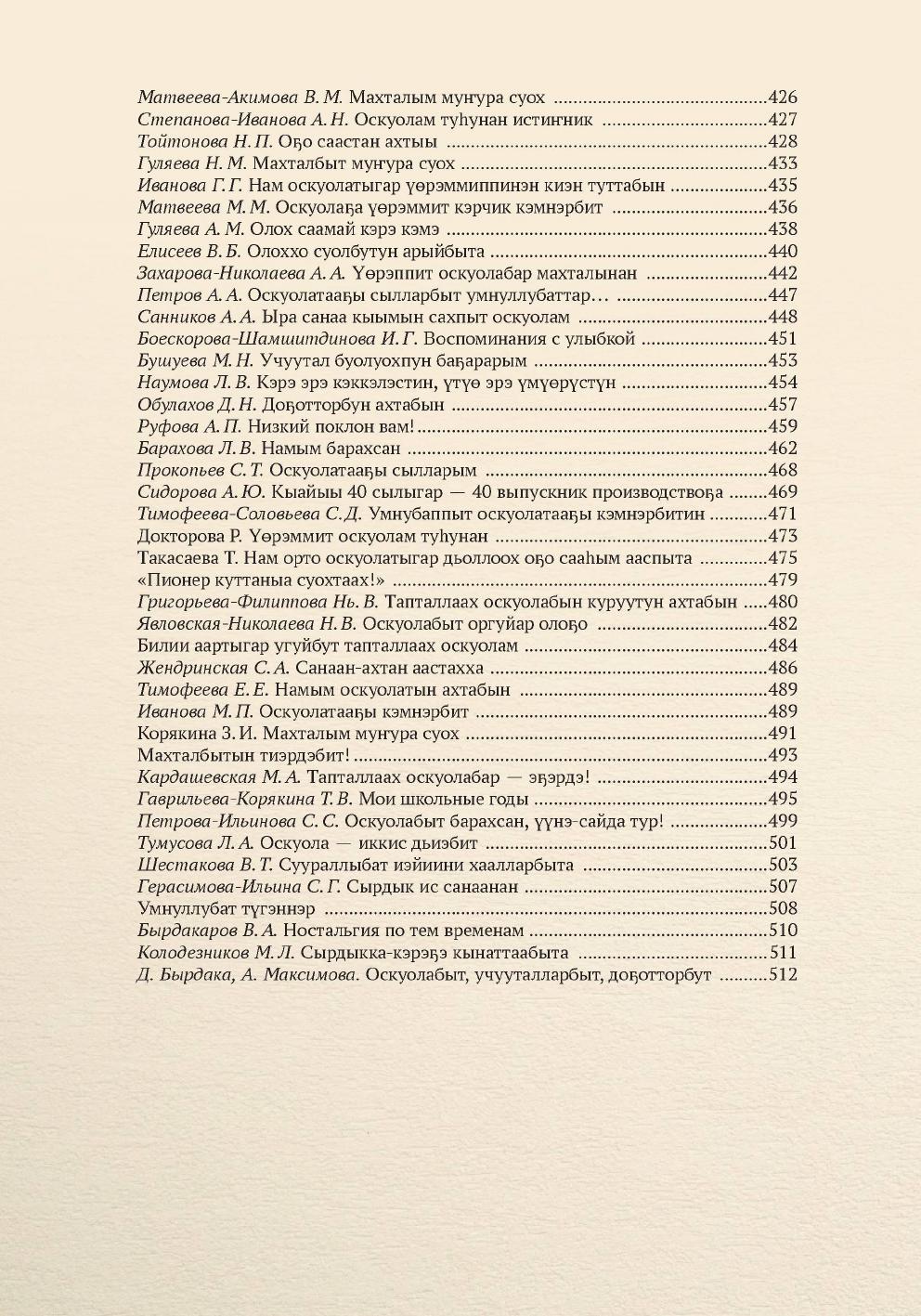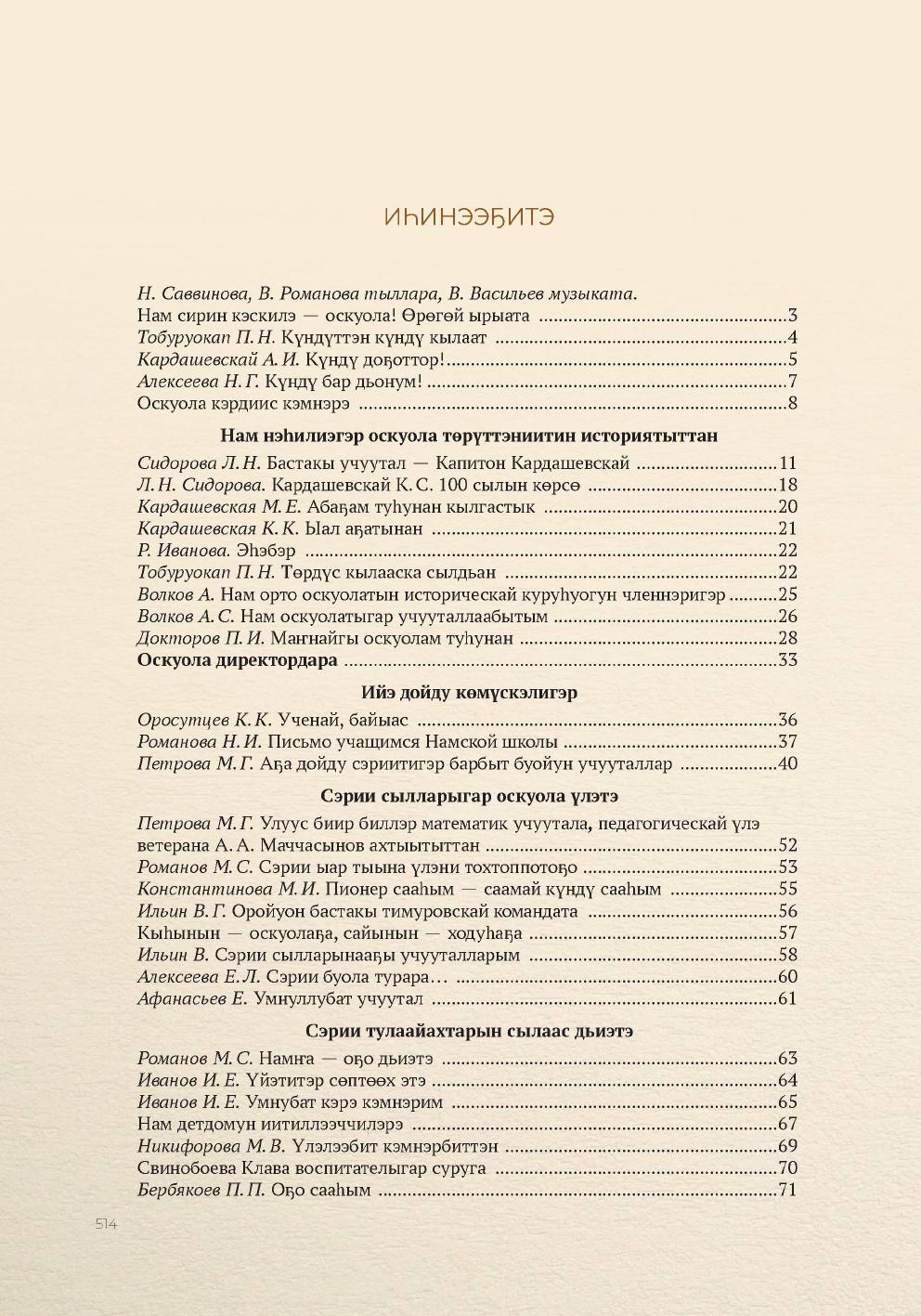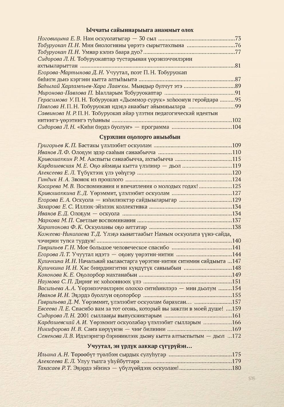 Үөһээ Бүлүү улууһун П. Н. Тобуруокап аатынан Нам орто оскуолатын 95 сыла : [ахтыылар] / хомуйан оҥордулар: Л. Н. Сидорова, Н. Р. Саввинова, М. Г. Петрова, У. Ю. Саввинова. - Дьокуускай : Офсет, 2024. - 25 см. Книга посвящена 95-летию Намской средней общеоразовательной школы Верхневилюйского улуса. В сборник вошли материалы об истории школы, достижениях педагогического коллектива, учащихся, также воспоминания учителей, выпускников. Т. 1. - 2024. - 517, [1] с.