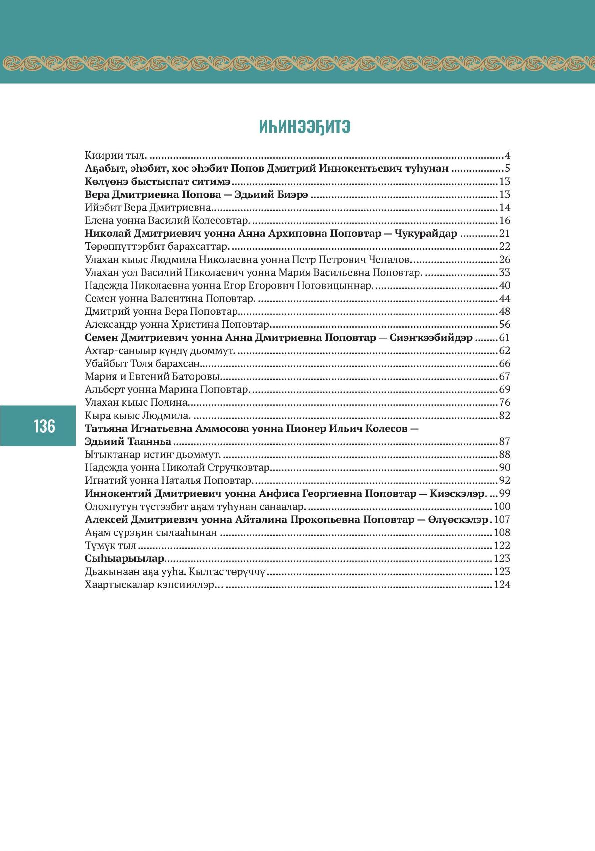 Көлүөнэ быстыспат ситимэ : ахтыылар / хомуйан оҥордулар: А. П. Попова, И. П. Попов, Н. Д. Попова ; матырыйаалы бэлэмнээтилэр: А. Д. Попов, Л. Н. (Чепалова) Попова, П. С. Попова, Е. И. Колесова. - Дьокуускай : Дани-Алмас, 2024. - 136 с.