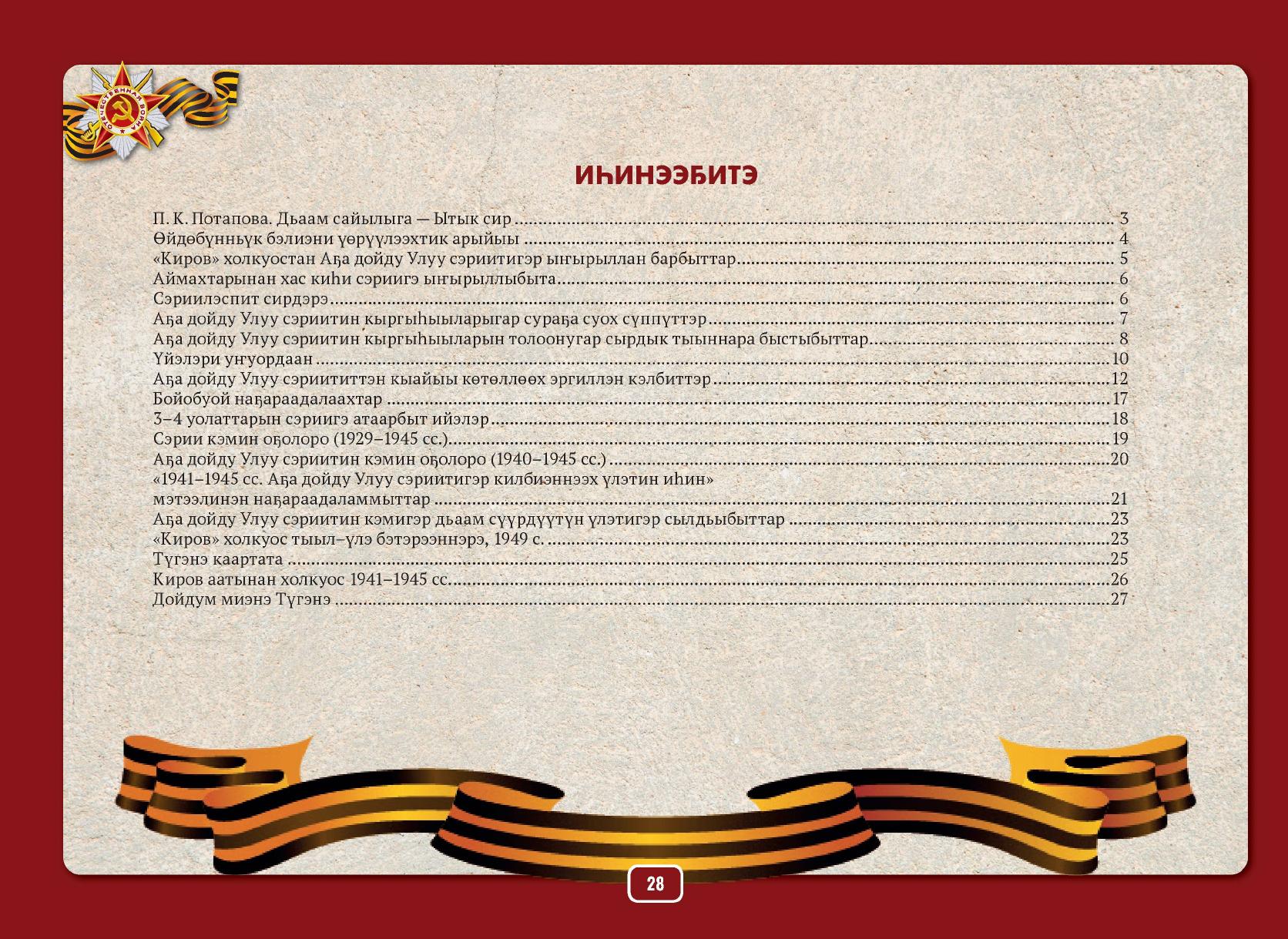 Махтанабыт! Киэн туттабыт! Сүгүрүйэбит! : (2-с Одуну нэһилиэгин "Киров" холкуоһа 1941-1945 сс. Аҕа дойду Улуу сэриитин сылларыгар) : [альбом-кинигэ] / хомуйан оҥордо М. И. Леонтьева ; бэчээккэ бэлэмнээтэ В. В. Мухоплева ; [киирии тылы суруйда П. К. Потапова]. - Дьокуускай : Дани-Алмас, 2024. - 28 с.
