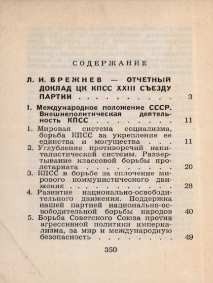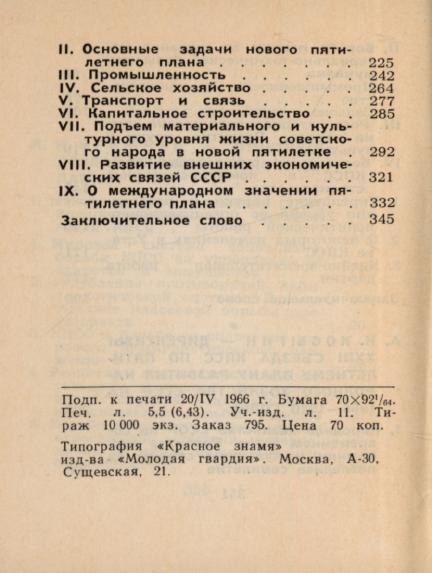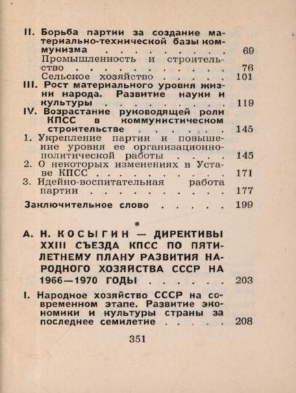 Отчетный доклад ЦК КПСС XXIII съезду Коммунистической партии : 29 марта 1966 года / [Л. И. Брежнев, А. Н. Косыгин]. Директивы XXIII съезда КПСС по пятилетнему плану развития народного хозяйства СССР развития на 1966-1970 годы. 5 апреля 1966 года / XXIII съезд КПСС. - [Москва] : Молодая гвардия, 1966. - 352 с.