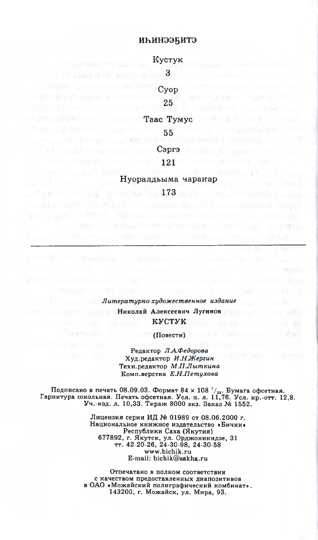 Бу кинигэҕэ СР норуодунай суруйааччыта Николай Лугинов "Кустук", "Суор", "Таас Тумус", "Сэргэ", "Нуоралдьыма чараҥар" диэн киэҥ биһирэбили ылбыт сэһэннэрэ киирдилэр. Автор олоҕу анааран көрүүтэ, дьон бэйэ икки ардыгар уустук сыһыана уйулҕаны долгутардыы бу айымньыларга арыллыбыт