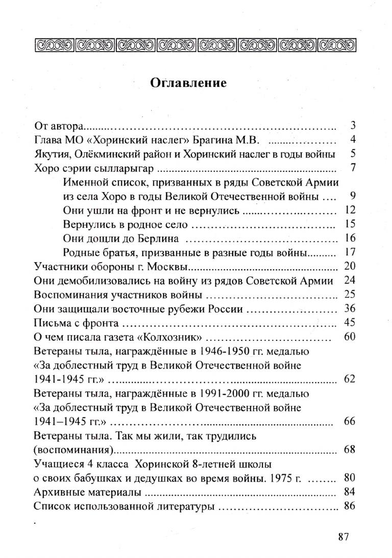 В книге собраны материалы об участниках ВОВ 1941-1945 гг. и о труде ветеранов тыла Хоринского наслега Олекминского улуса РС(Я)