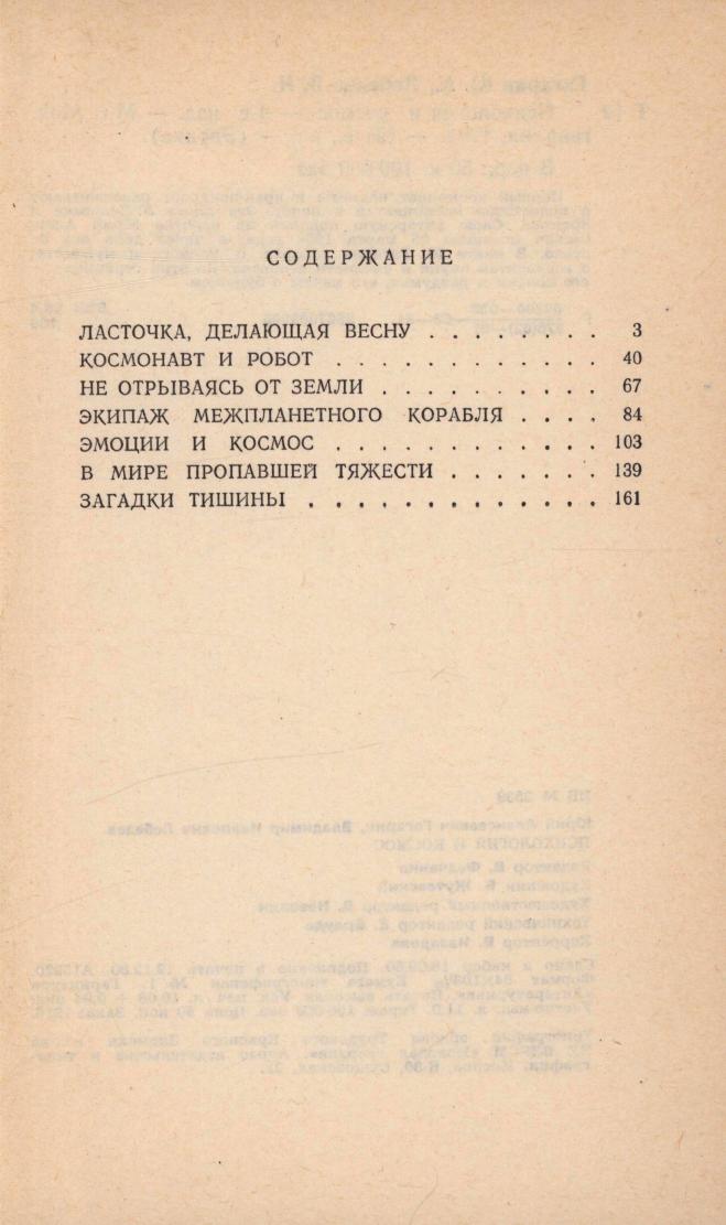 Первый космонавт планеты и врач-психолог рассказывают о подготовке космонавтов в полет. Эта книга о Человеке и Космосе. Свою авторскую подпись на верстке Юрий Алексеевич поставил 25 марта 1968 года, а через день его не стало. В книге Ю. Гагарин говорит о космосе и мужестве, о горизонтах науки и смелости человека. На этих страницах — его поиски и раздумья, его мечты о будущем