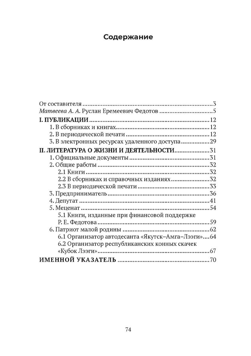 Биобиблиографический указатель посвящен жизни и деятельности заслуженного работника народного хозяйства Республики Саха (Якутия), Почетного работника торговли Республики Саха (Якутия), отличника сельского хозяйства Республики Саха (Якутия), депутата Государственного Собрания (Ил Тумэн) VI созыва, индивидуального предпринимателя, известного мецената, общественного деятеля Руслана Еремеевича Федотова