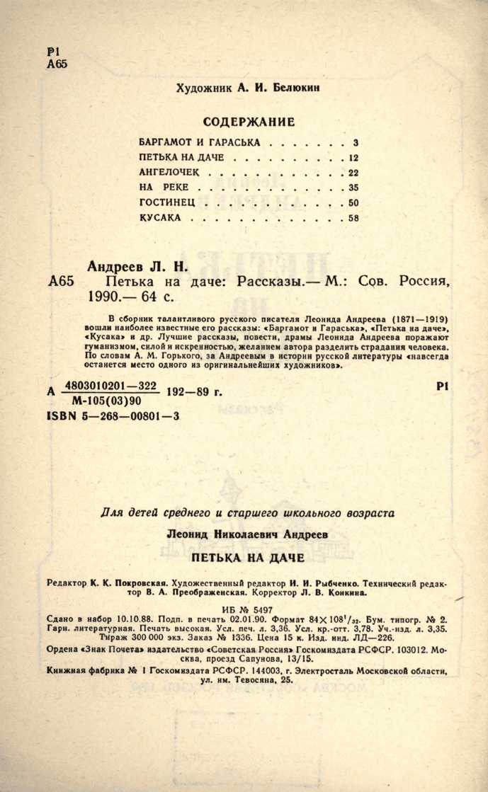 В сборнике талантливого русского писателя Леонида Андреева (1871-1919) вошли наиболее известные его рассказы: "Баргамот и Гараська", "Петька на даче", "Кусака" и др. Лучшие рассказы, повести, драмы Леонида Андреева поражают гуманизмом, силой и искренностью, желанием автора разделить страдания человека. По словам А. М. Горького, за Андреевым в истории русской литературы "навсегда останется место одного из оригинальнейших художников".