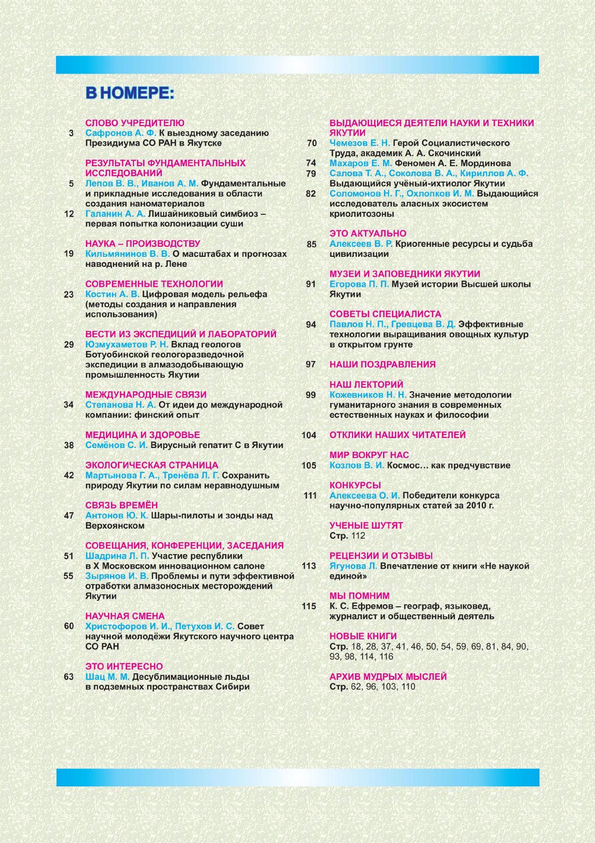 Наука и техника в Якутии : научно-популярный журнал / учредители: Министерство науки и профессионального образования РС (Я), Якутский научныйцентр СО РАН, Академия наук РС(Я), Якутский государственный университет им. М. К. Аммосова. - Якутск : Издательство СО РАН, Якутский филиал, 2011, N 1 (20). - 116 с.