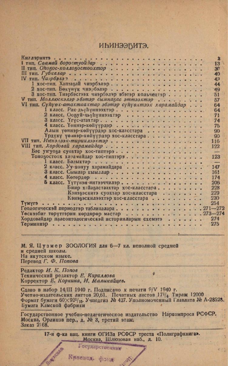 Зоология : толорута суох отто уонна отто оскуола 6-с уонна 7-с кл. үөрэнэр книга / М. Я. Цузмер ; Г. Ф. Попов тылбааһа - Москуба : РСФСР ҮНК государственнай үөрэх-педагогика издательствата, 1940. - 275, [1] с.