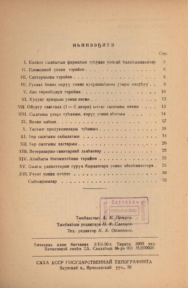 Колхоз сылгытын ферматыгар үлэни тэрийии / СР сүөһү иитиитин чинчийэр опытнай станция. - Якутскай : ЯКГИЗ, 1950. - 39 с.