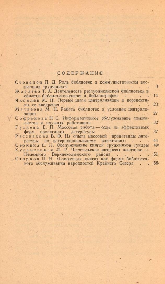 Книга предлагает читателю некоторые материалы научно-практической конференции библиотечных работников республики, состоявшейся в октябре 1975 г. Обсуждены вопросы дифференцированного обслуживания читателей в условиях Севера и централизации сети библиотек