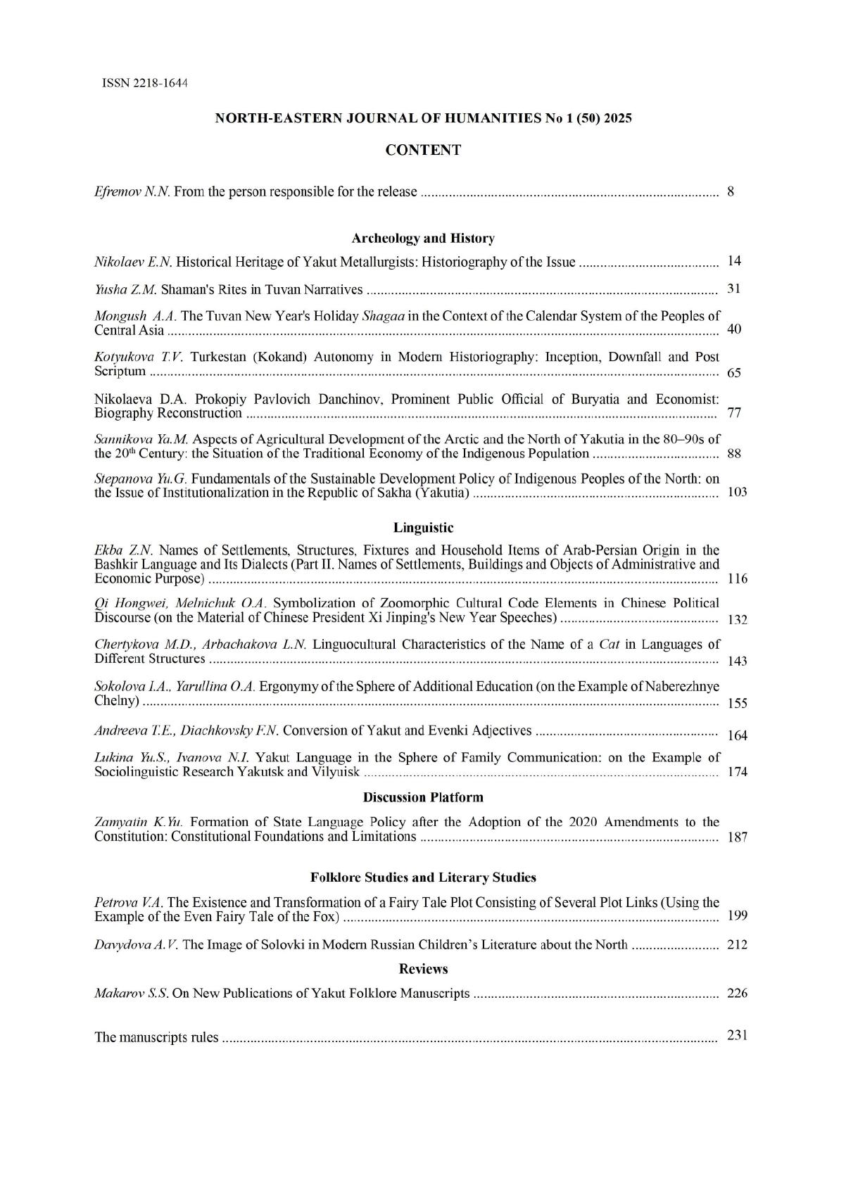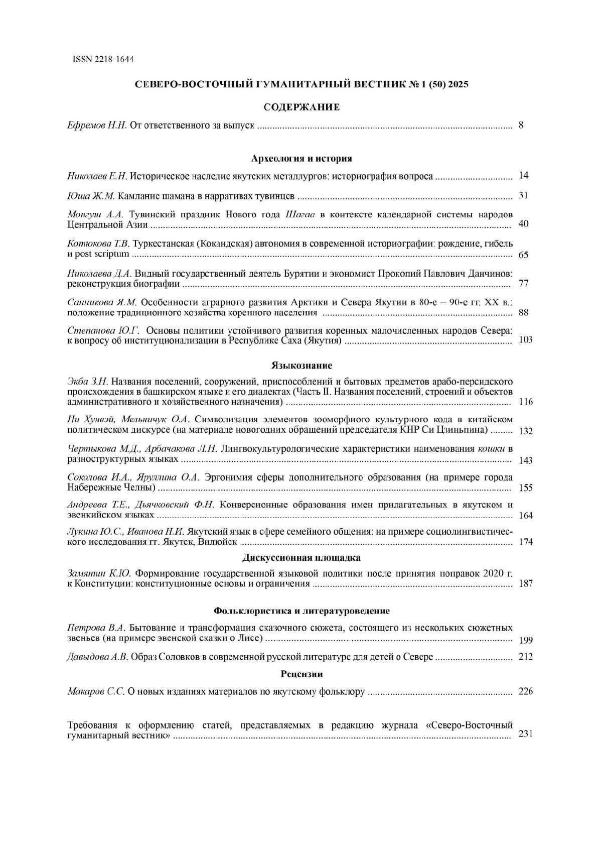 Северо-Восточный гуманитарный вестник : научный журнал / учредитель Инcтитут гуманитарных исследований и проблем малочисленных народов Севера СО РАН ; редколлегия: Ефремов Н. Н.(главный редактор) и др. - Якутск : Федеральное государственное бюджетное учреждение науки Институт гуманитарных исследований и проблем малочисленных народов Севера Сибирского отделения Российской академии наук, 2010-. - ISSN 2218-1644 (print). - 2025, N 1 (50). - 231 с.