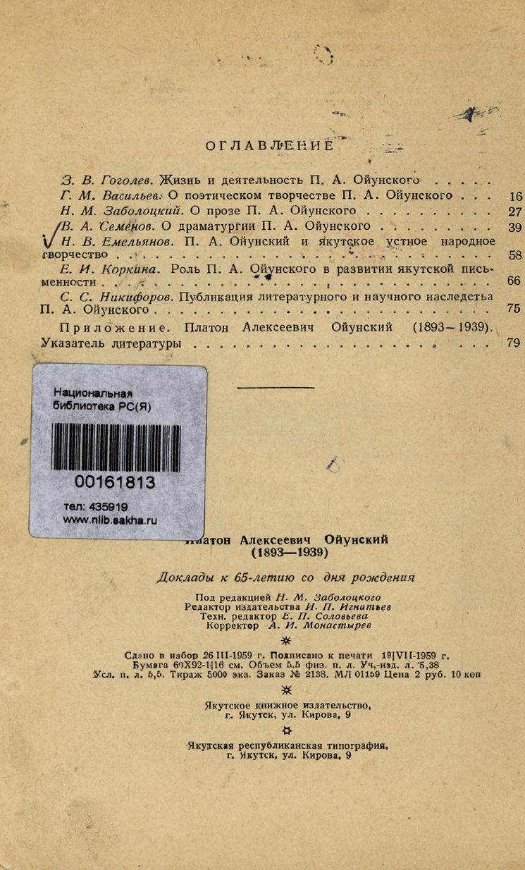 Платон Алексеевич Ойунский (1893-1939) = Платон Алексеевич Ойуунускай : доклады к 65-летию со дня рождения / под редакцией Н. М. Заболоцкого. - Якутск : Якутское книжное издательство, 1959. - 86, [2] с.