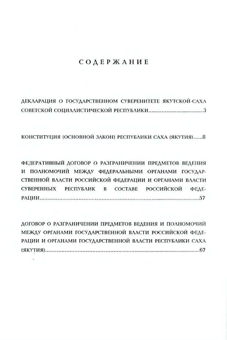 Декларация о государственном суверенитете Якутской-Саха Советской Социалистической Республики ; Конституция (основной закон) Республики Саха (Якутия) ; Федеративный договор о разграничении предметов ведения и полномочий между федеральными органами государственной власти Российской Федерации и органами власти суверенных республик в составе Российской Федерации ; Договор о разграничении предметов ведения и полномочий между органами государственной власти Российской Федерации и органами государственной власти Республики Саха (Якутия) / [ред. С. В. Охлопкова]. Конституция (основной закон) Республики Саха (Якутия). Федеративный договор о разграничении предметов ведения и полномочий между федеральными органами государственной власти Российской Федерации и органами власти суверенных республик в составе Российской Федерации. Договор о разграничении предметов ведения и полномочий между органами государственной власти Российской Федерации и органами государственной власти Республики Саха (Якутия). - Якутск : [б. и.], 2000. - 81, [1] с.