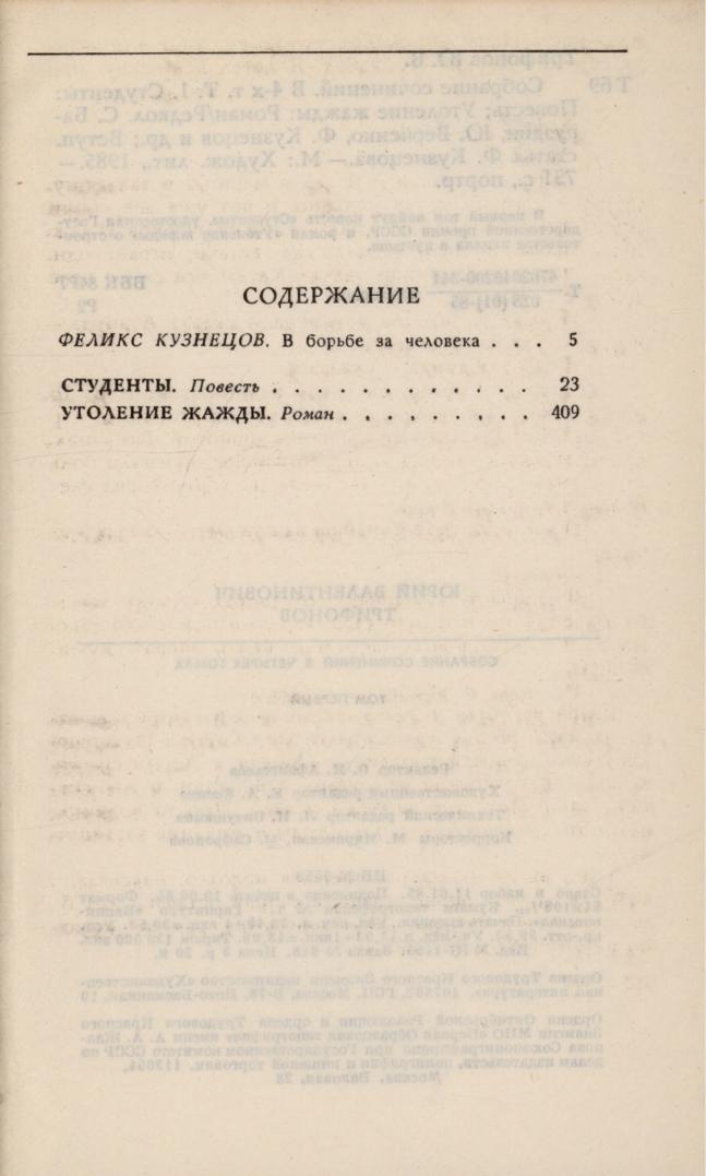 Собрание сочинений : в 4 томах / Юрий Трифонов ; редколлегия: С. А. Баруздин, Ю. Н. Верченко, Ф. Ф. Кузнецов [и др.] ; вступительная статья Ф. Кузнецова. - Москва : Художественная литература, 1985-1987. - 20 см. Т. 1: Студенты : повесть. Утоление жажды : роман. - 1985. - 749, [2] с.