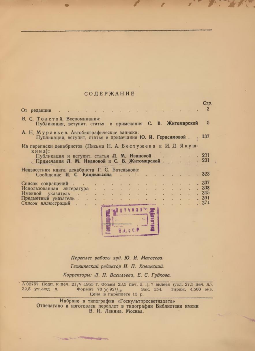 Декабристы : новые материалы / Министерство культуры РСФСР, Государственная библиотека СССР им. В. И. Ленина, Труды Отдела рукописей ; под редакцией М. К. Азадовского. - Москва : ГБ СССР, 1955. - 375 с., [7] л. портр.
