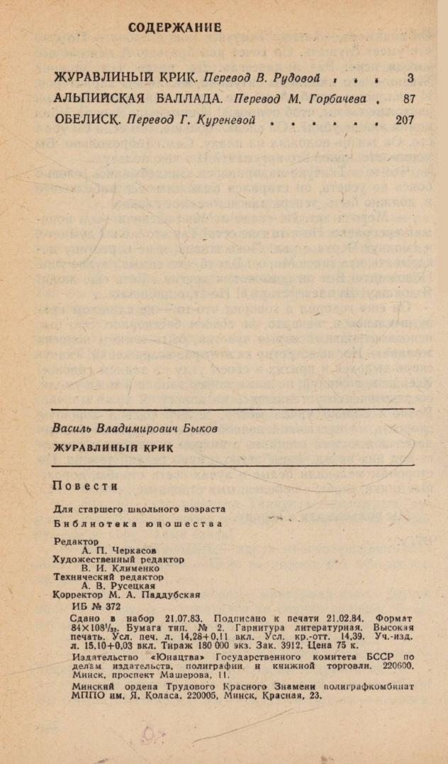Журавлиный крик : повести : [для старшего школьного возраста] / Василь Быков ; [перевод с белорусского В. Д. Рудовой, М. П. Горбачева, Г. В. Куреневой]. - Минск : Юнацтва, 1984. - 270, [2] с., [1] отд. л. портр.