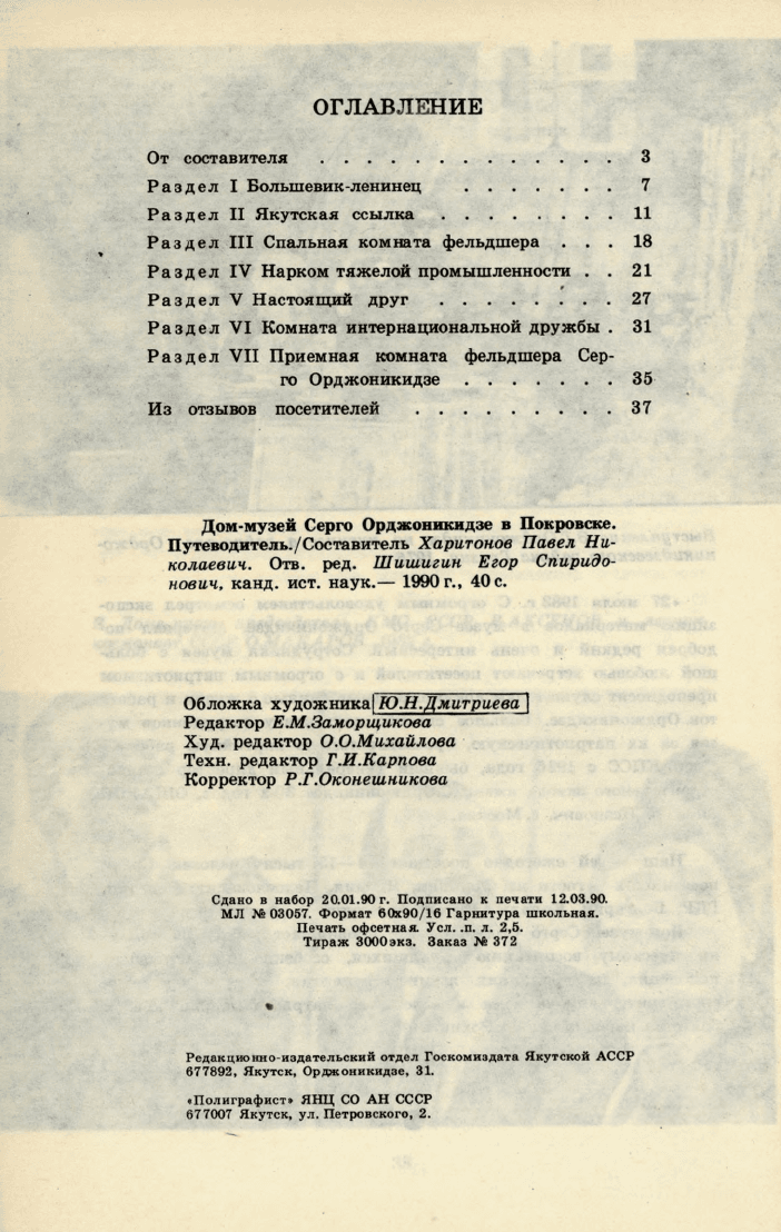 Дом-музей Серго Орджоникидзе в Покровске : путеводитель / Якутский государственный объединенный музей истории и культуры народов Севера им. Е. Ярославского, Орджоникидзевское районное отделение общества охраны памятников истории и культуры ; [составитель П. Н. Харитонов ; ответственный редактор Е. С. Шишигин]. - Якутск : Полиграфист, 1990. - 40 с. : ил.