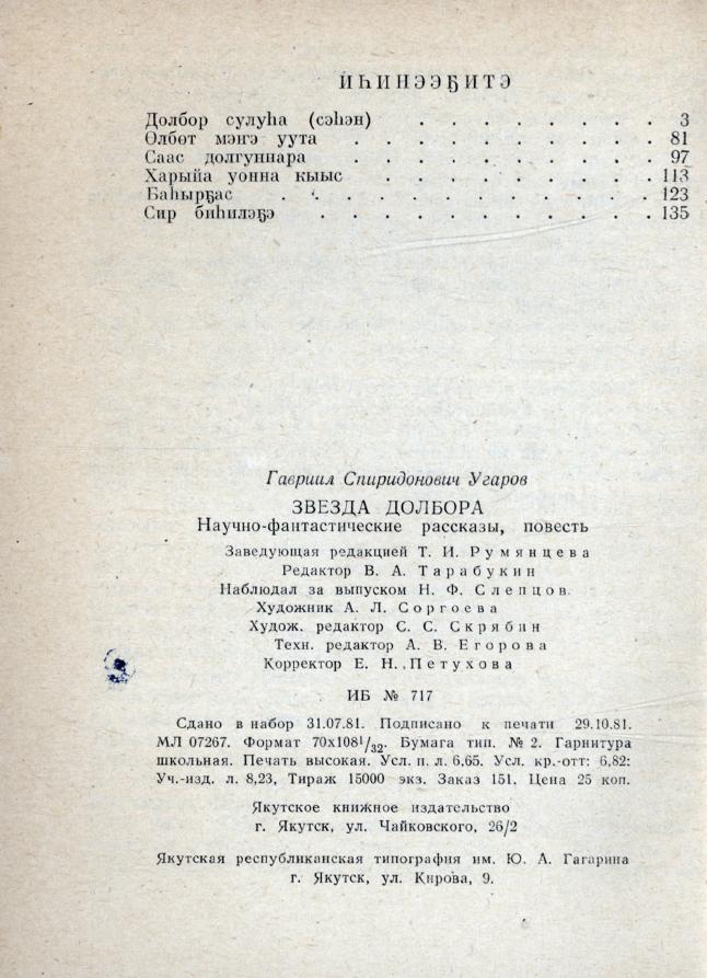 Долбор сулуһа : научнай-фантастическай сэһэн, кэпсээннэр / Гавриил Угаров ; [А. Л. Соргоева уруһуйдара]. - Якутскай : Саха сиринээҕи кинигэ издательствота, 1981. - 150, [2] с.