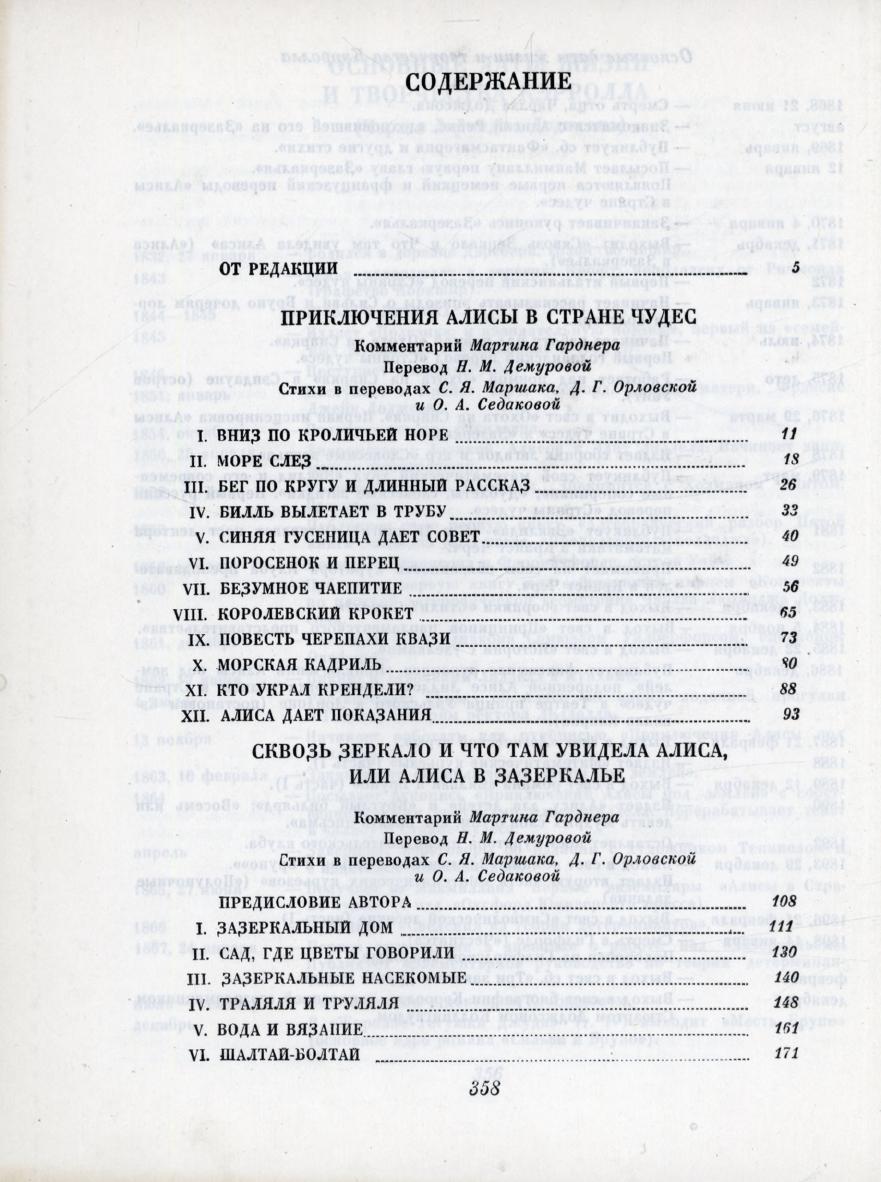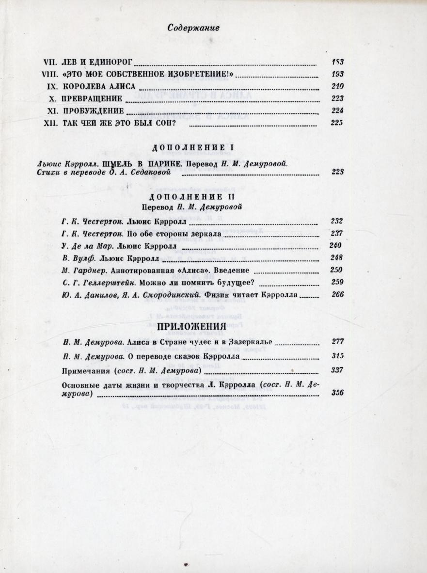 Приключения Алисы в стране чудес ; Сквозь зеркало и что там увидела Алиса, или Алиса в Зазеркалье / Льюис Кэрролл ; подготовка, [перевод с английского и статьи написала] Н. М. Демурова ; [комментарий М. Гаднера ; стихи в переводах С. Я. Маршака, Д. Г. Орловской и О. А. Седаковой] ; иллюстрации Джона Тенниела. - Москва : Наука, 1978. - 359 c. : ил., портр. ).