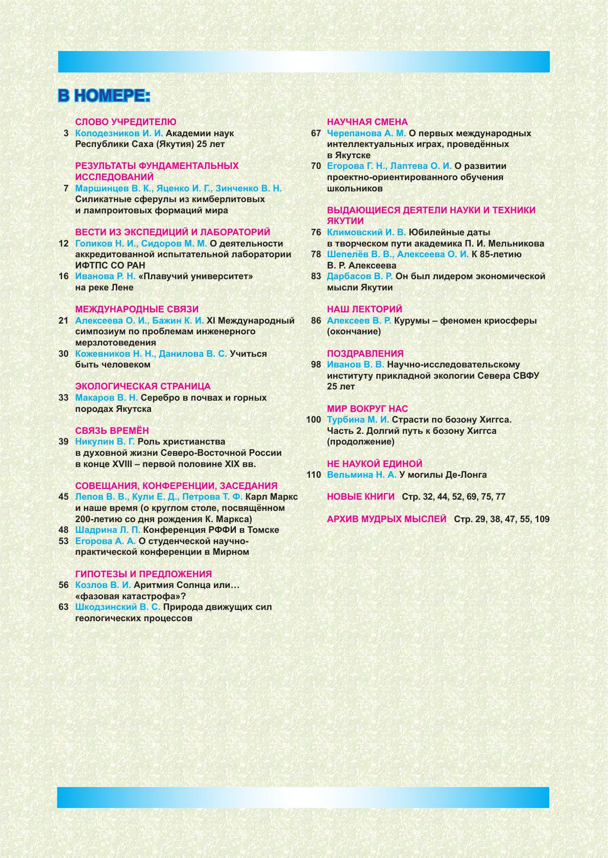 Наука и техника в Якутии : научно-популярный журнал / учредители: Министерство науки и профессионального образования РС (Я), Якутский научный центр СО РАН, Академия наук РС(Я), Якутский государственный университет им. М. К. Аммосова. - Якутск : Издательство СО РАН, Якутский филиал, 2018, N 2 (35). - 116 с.