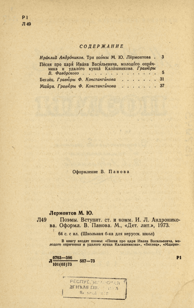 В книгу вошли поэмы: "Песня про царя Ивана Васильевича, молодого опричника и удалого купца Калашникова", "Беглец", "Мцыри"