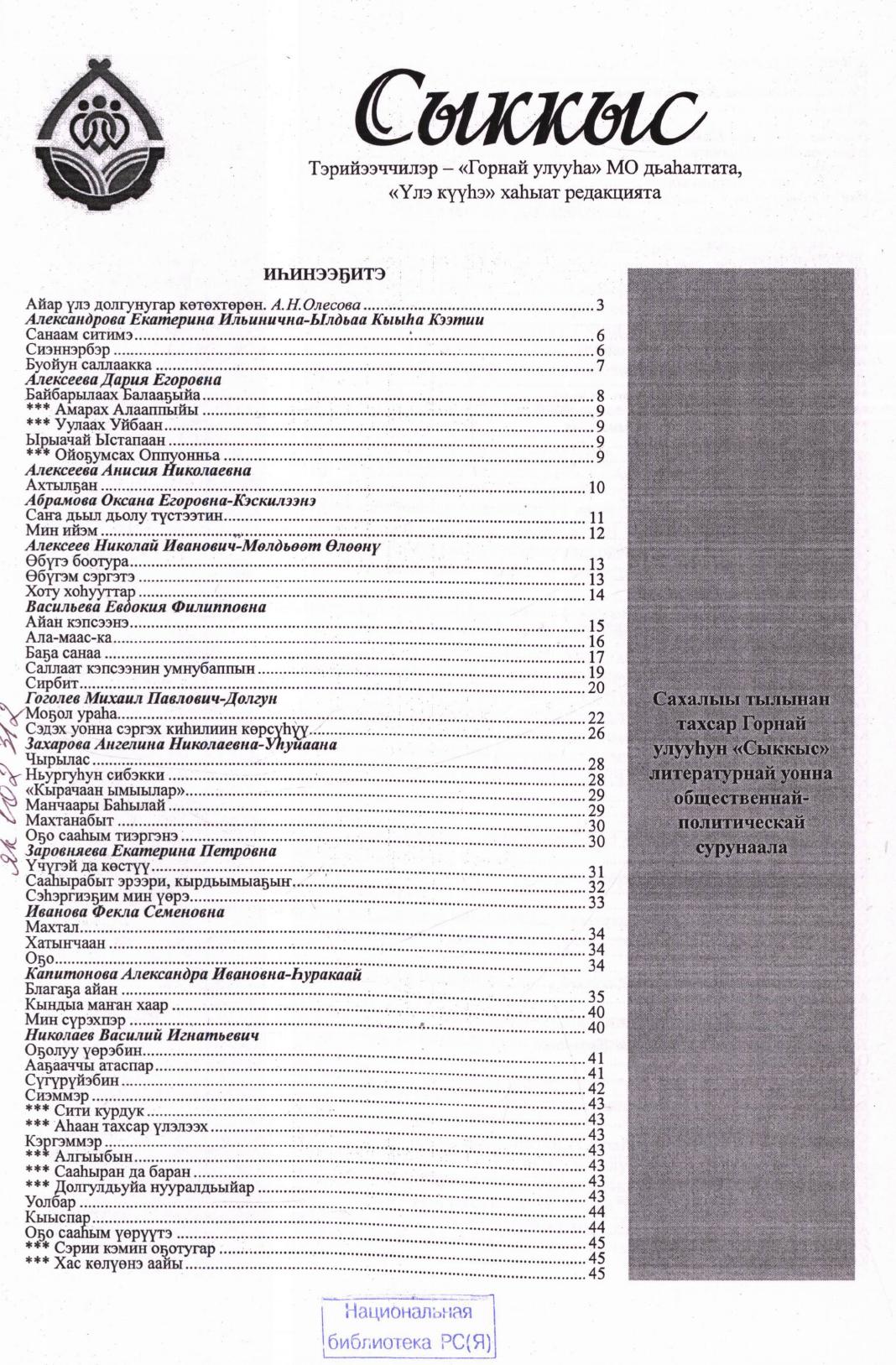 Сыккыс : уус-уран литературнай уонна общественнай-политическай сурунаал / Горнай улуустааҕы литературнай түмсүү. - Бердигестях : Редакция газеты "Үлэ күүһэ", 2007.
