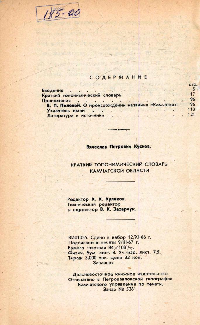 Краткий топонимический словарь Камчатской области : (из истории происхождения географических названий) / В. П. Кусков ; [под редакцией Б. И. Пийпа и В. Н. Виноградова] ; Камчатское отделение географического общества СССР. - Петропавловск-Камчатский : Дальневосточное книжное изд-во, 1967. - 126, [2] c.