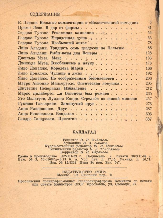 Бандагал : сборник научно-фантастических рассказов / перевод с итальянского Л. Вершинина ; составитель Я. Лесюк ; предисловие Е. Парнова ; [иллюстрации: Б. А. Алимов]. - Москва : Мир, 1970. - 392 с.