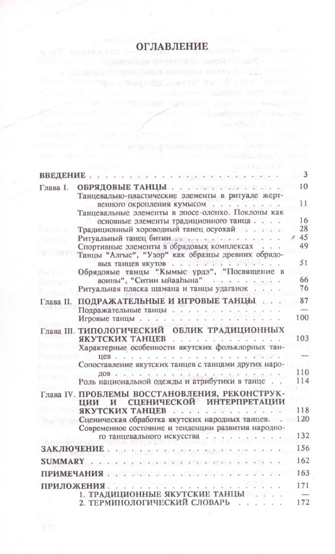 В книге обобщены данные по истории и современному состоянию традиционной якутской хореографии, предпринята попытка выявления генезиса традиционных якутских танцев в контексте обрядовой культуры народа. Примечательно, что якутские танцы рассматриваются в сравнении с танцами других народов Сибири. Автор делает вывод, что превалирующая часть элементов лексического фонда якутского танца обнаруживает черты близости с танцами тюрко-монгольских народов Южной Сибири, а северные элементы рассматривает как позднейшие наслоения