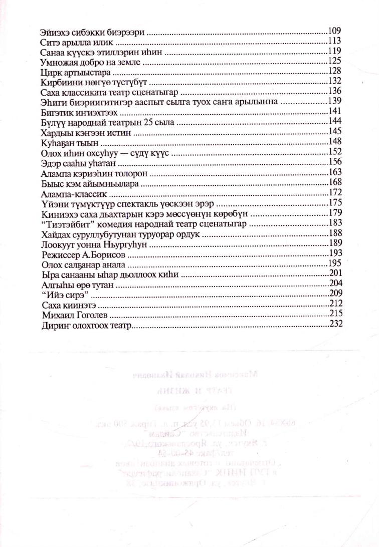 В книгу вошли статьи, рецензии, интервью автора о театральной, культурной жизни республики, постановках и спектаклях, о творчестве якутских актеров, режиссеров, вышедшие в разные годы в якутской и российской печати