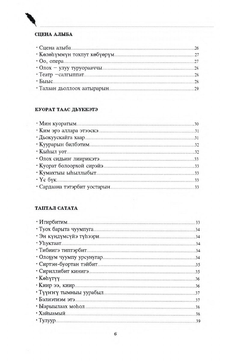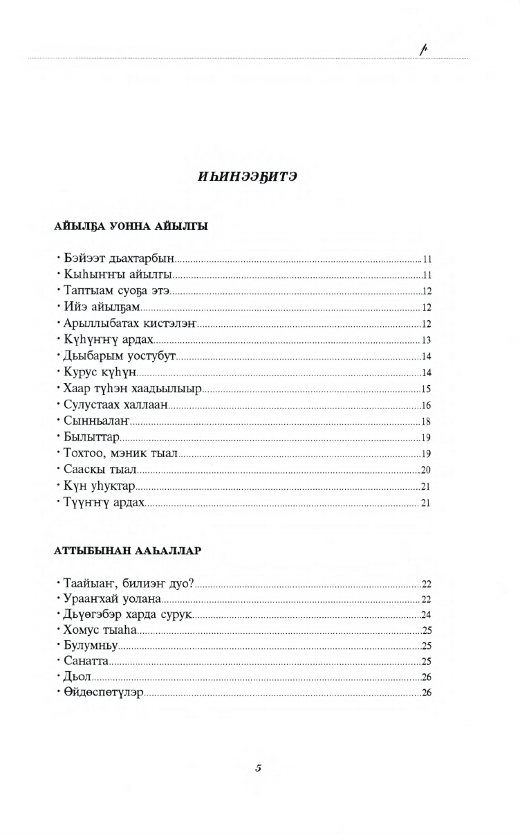 "Магические стихи". Здесь собраны ранее не напечатанные стихи Е.В. Слепцовой-Куорсуннаах. Сборник состоит из нескольких разделов. Автор своими стихами выражает эпические, лирические, патриотические чувства родного народа. Глубокие смысловые коллизии стихов обрамляются богатым материнским языком, тем самым сильнее притягивают читателя в магию слов.