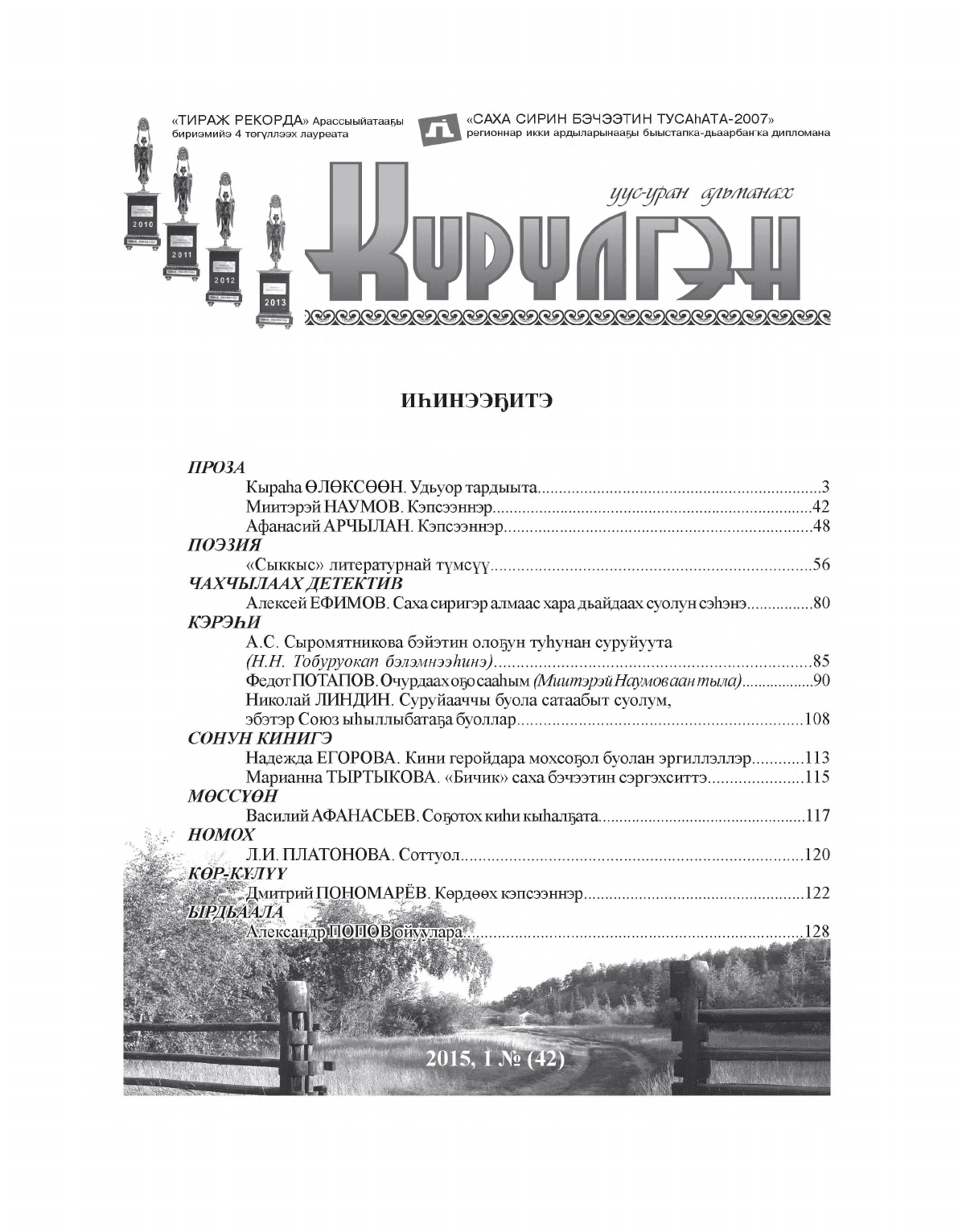 Күрүлгэн : уус-уран сурунаал / [редактор А. Г. Гуринов]. - Дьокуускай : Ситим Медиа, 2006 -. 2015, N 1 (42). - 2015. - 128 с.