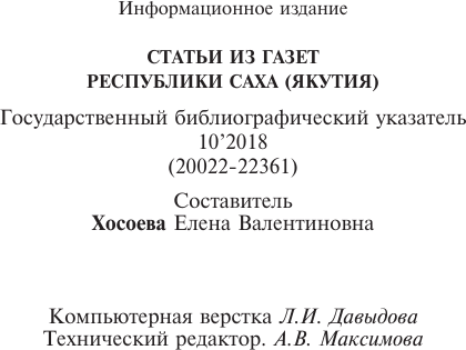 2018, N 9 (18205-20021), 2018, N 9 (18205-20021), 2018 - 10. Статьи из газет Республики Саха (Якутия) = Саха Өрөспүүбүлүкэтин хаһыаттарыгар киирбит ыстатыйалар: государственный библиографический указатель. судаарыстыбаннай библиографическай ыйынньык