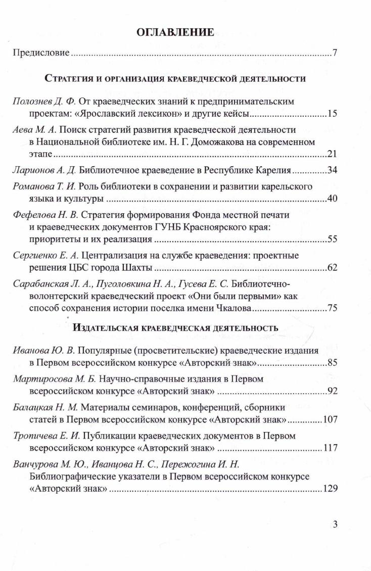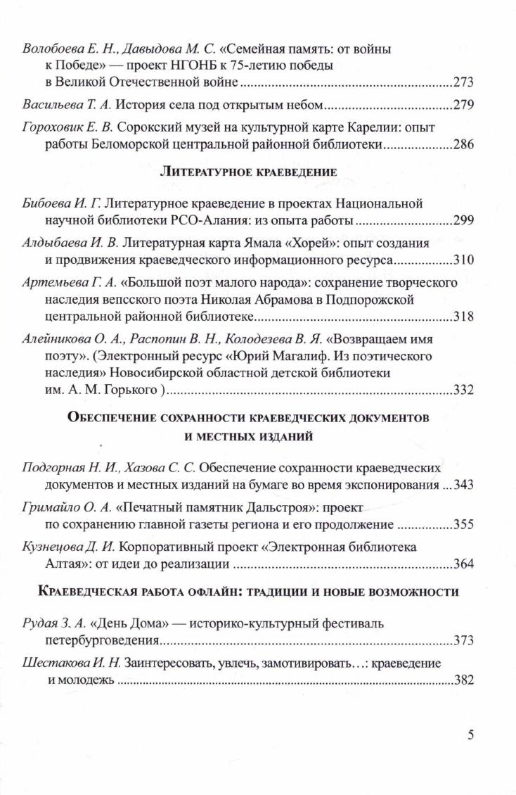 В статьях и материалах сборника на опыте библиотек разных типов и ведомств рассмотрен широкий круг актуальных проблем практики библиотечного краеведения: его общей стратегии в современных условиях, издательской, архивной и музейно-выставочной работы, создания и продвижения электронных краеведческих ресурсов и продуктов, интернет-проектов и формирования электронных краеведческих библиотек, новых направлений и форм литературного краеведения; краеведческой работы "офлайн"; обеспечения сохранности краеведческих документов и местных изданий в процессе их использования. Предназначается сотрудникам библиотек, руководителям органов управления библиотечным делом в регионах, преподавателям и студентам высших учебных заведений