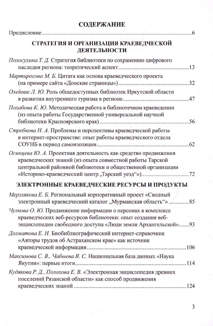 В статьях и материалах сборника на опыте библиотек разных типов и ведомств рассмотрен широкий круг актуальных проблем практики библиотечного краеведения: его общей стратегии в современных условиях, издательской, архивной и музейно-выставочной работы, создания и продвижения электронных краеведческих ресурсов и продуктов, интернет-проектов и формирования электронных краеведческих библиотек, новых направлений и форм литературного краеведения; краеведческой работы "офлайн"; обеспечения сохранности краеведческих документов и местных изданий в процессе их использования. Предназначается сотрудникам библиотек, руководителям органов управления библиотечным делом в регионах, преподавателям и студентам высших учебных заведений.