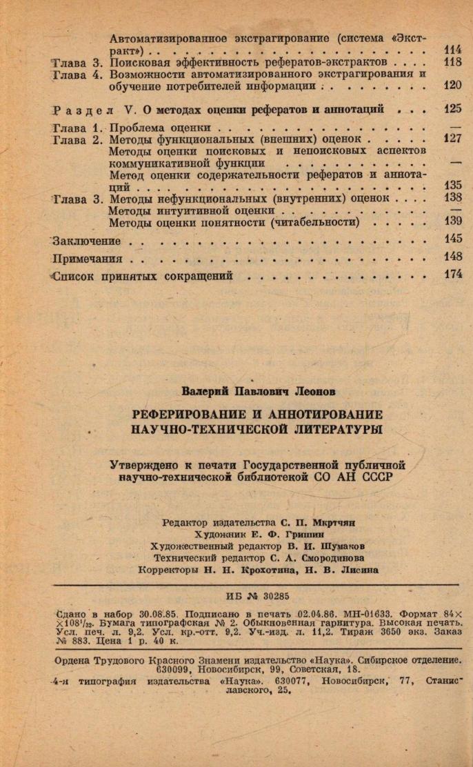 Реферирование и аннотирование научно-технической литературы / В. П. Леонов ; ответственный редактор Б. С. Елепов ; Академия наук СССР, Сибирское отделение, Государственная публичная научно-техническая библиотека. - Новосибирск : Наука : Сибирское отделение, 1986. - 172, [4] с.