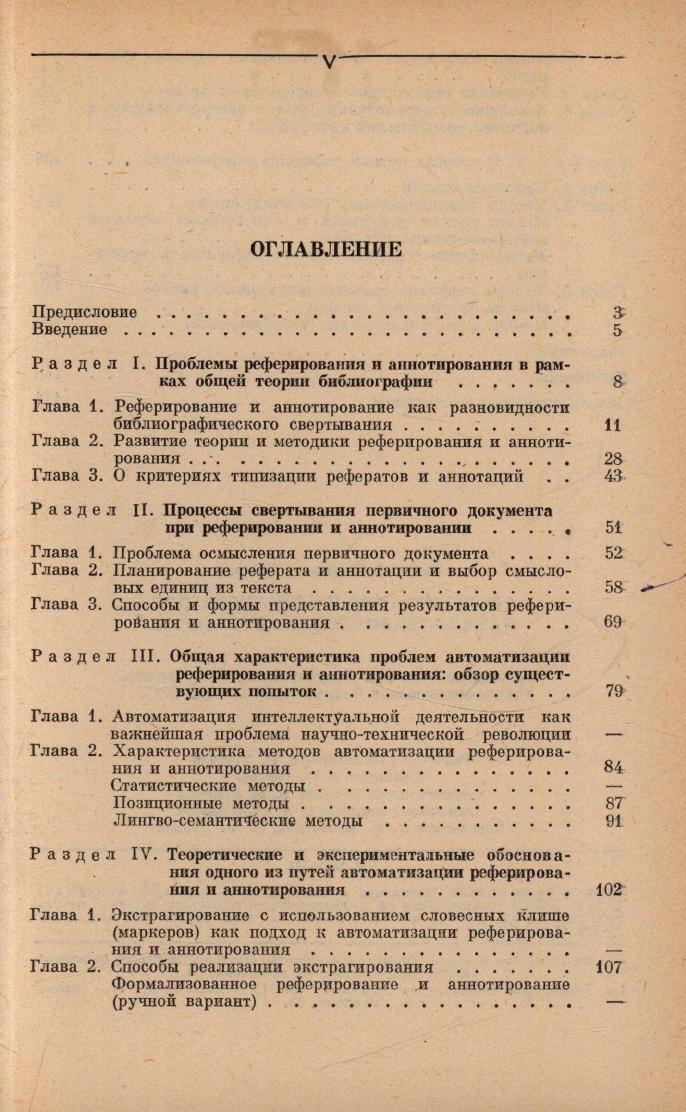 В монографии рассматривается развитие идей и методов ручного и автоматизированного свертывания информации в библиографии, информатике, библиотековедении. Дается анализ основных процессов аннотирования и реферирования, описываются новые эксперименты по методике экстрагирования текстов па ЭВМ и способы оценки формализованного реферирования