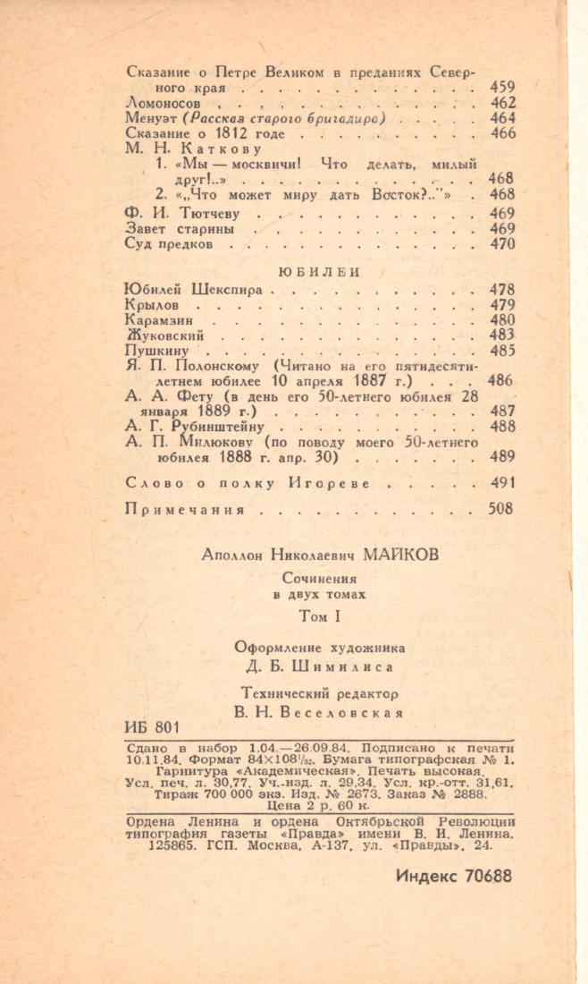 Сочинения : В 2 т. / А.Н. Майков ; [редакция и вступительная статья Ф. Я. Приймы ; примечание Л. Гейро ]. - М. : Правда, 1984-. - 20 см. - (Библиотека "Огонек". Отечественная классика). Т. 1. - 1984. - 576 с., 5 л. ил. Библиогр. в примеч.