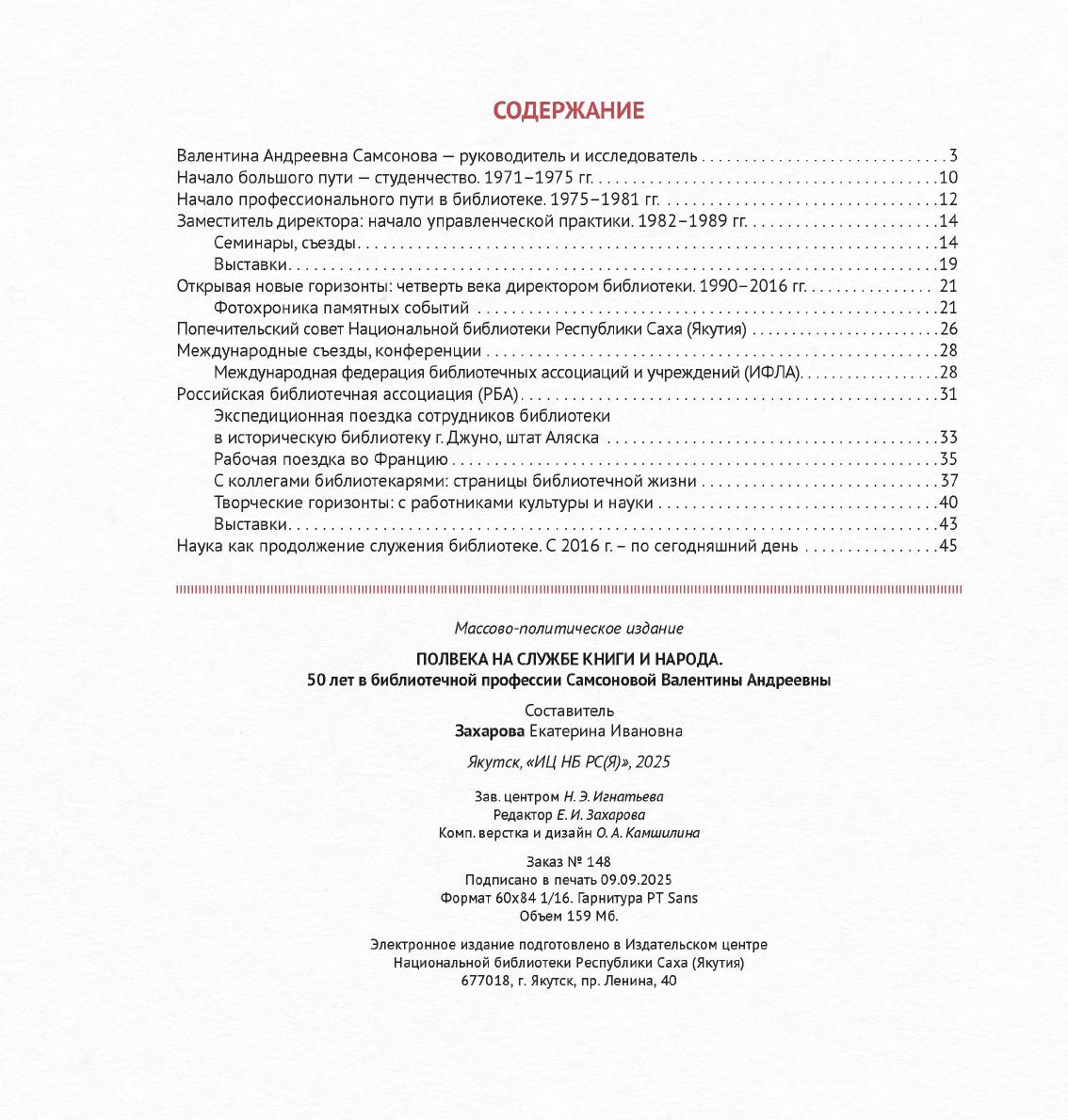 Полвека на службе книги и народа : 50 лет в библиотечной профессии Самсоновой Валентины Андреевны / составитель Е. И. Захарова ; [предисловие Г. Ф. Леверьевой]. - Якутск : ИЦ НБ РС(Я), 2025. - 1 файл (46, [2] с.