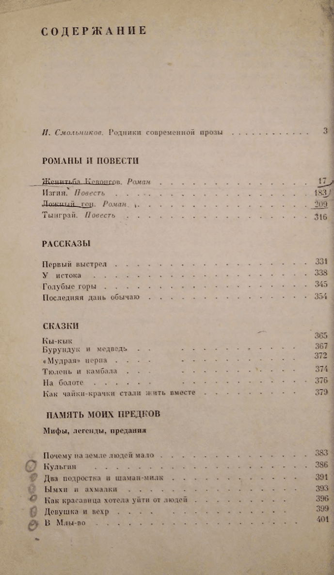 В сборник избранных произведений советского писателя В. Санги вошли роман "Женитьба Кевонгов", рисующий широкую панораму жизни маленького народа нивхов в условиях дореволюционной России, роман "Ложный гон", повествующий о сегодняшнем дне сахалинских охотников; повести "Изгин" и "Тынграй", рассказы, а также нивхские легенды и сказки в литературной обработке писателя