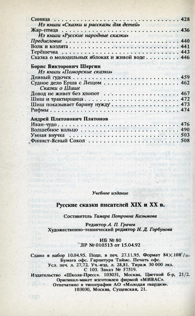 Русские сказки писателей XIX и XX веков : [сборник] / составитель Т. П. Казымова ; вступительная статья Е. А. Самоделовой ; иллюстрации Т. И. Алексеевой. - Москва : Школа-пресс, 1995. - 527, [1] с.