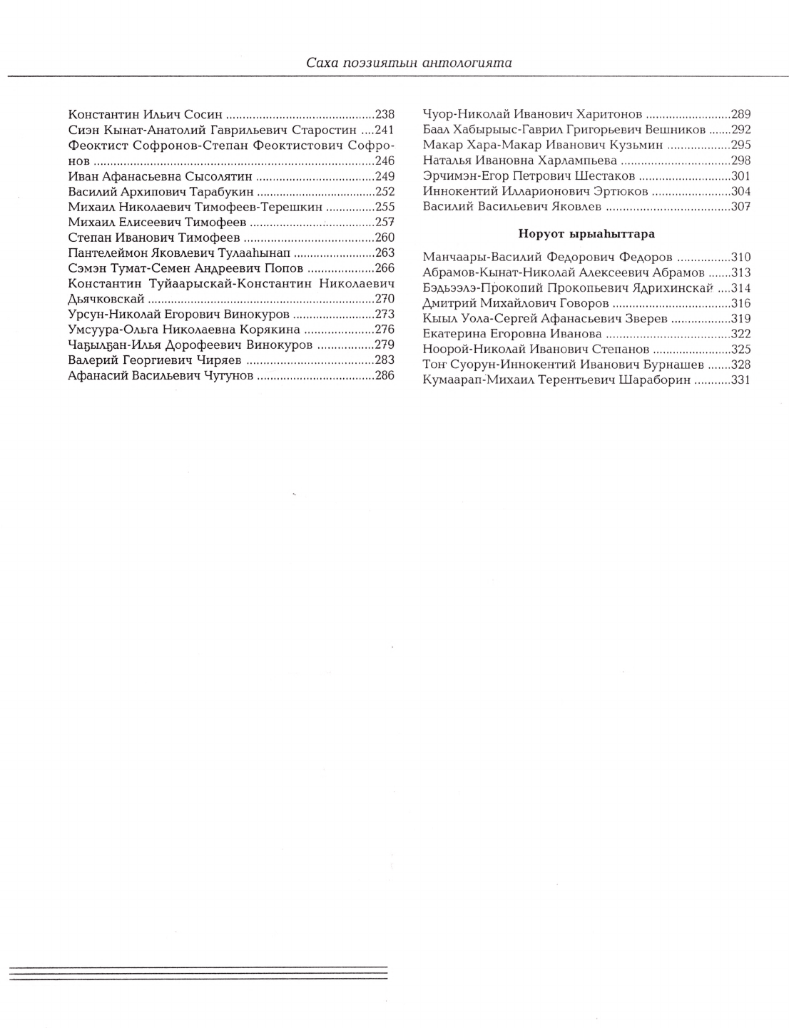Сүүрбэһис үйэ хоһоонньуттара : саха поэзиятын антологията / [хомуйан оҥордулар: Н. Е. Винокуров - Урсун, С. И. Тарасов, Н. И. Харлампьева]. - Дьокуускай : Бичик, 2000. - 336 с.
