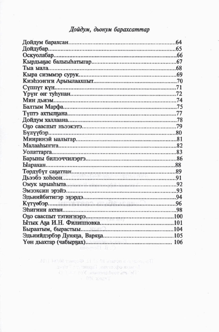 Учуутал Татьяна Ефремовна Винокурова оҕо аймаҕы сахабыт тылын сүөгэйигэр-сүмэтигэр үөрэтэр, уһуйар түбүктээх үлэтиттэн быыс булан, ийэ-аҕа, эбэ-эһэ курдук чугас дьонтон саҕалаан, төрөөбүт дойдуга, тулалыыр эйгэҕэ тапталы, ытыктабылы үөскэтэр, олох омсолоох өттүн ойуулуур хоһоонноро, чабырҕаҕа киирдилэр.