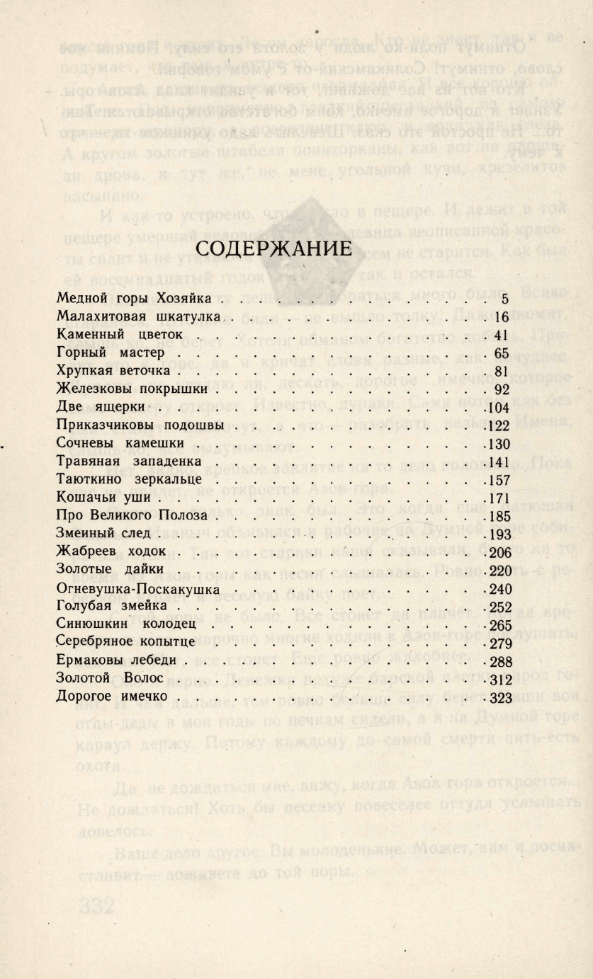 Основу настоящего издания составляют наиболее популярные сказы, объединенные образом Малахитницы - Хозяйки Медной горы. В них тесно переплетаются фантастические персонажи: Огневушка-Поскакушка, Великий Полоз, бабка Синюшка - образы трудовых людей старого Урала: "мастеров по каменному делу", "золотодобытчиков". Многие герои Бажова воссозданы на театральной сцене и киноэкране, в живописи и скульптуре